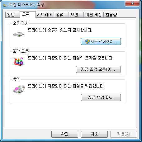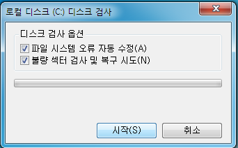 파일 시스템 오류 자동수정(A)와 불량 섹터 검사 및 복구 시도(N)을 모두 체크하고 시작을 클릭한 후 컴퓨터를 재부팅 합니다.