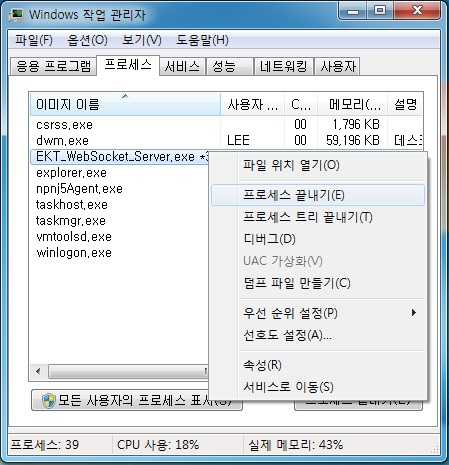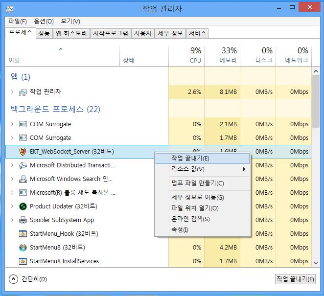 이런 경우 프로세스에 "EKT_WebSocket_Server.exe"이 나타나며, 해당 프로세스에 마우스오른쪽버튼 -> 프로세스 끝내기를 클릭 하여 종료 한다.