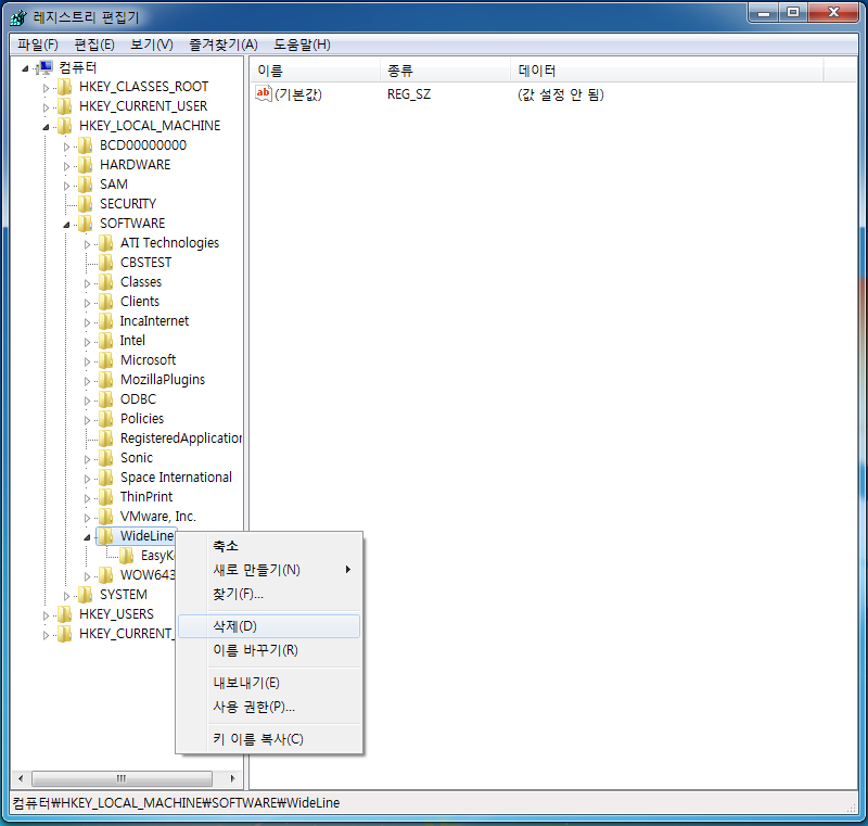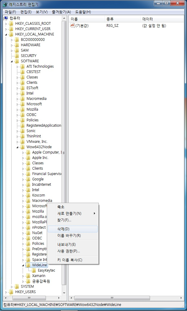 레지스트리에서 HKEY_LOCAL_MACHINE -> SOFTWARE -> Wow6432Node -> SOFTELEVEN 또는 WideLine을 찾은 후에