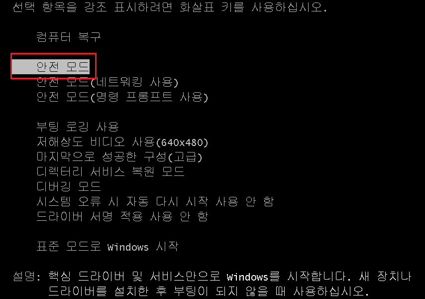 컴퓨터가 부팅이 될때 F8키를 여러번 눌러 주면, 다음과 같이 윈도우즈 모드 선택 화면이 나타나며, 안전모드를 선택한다.
