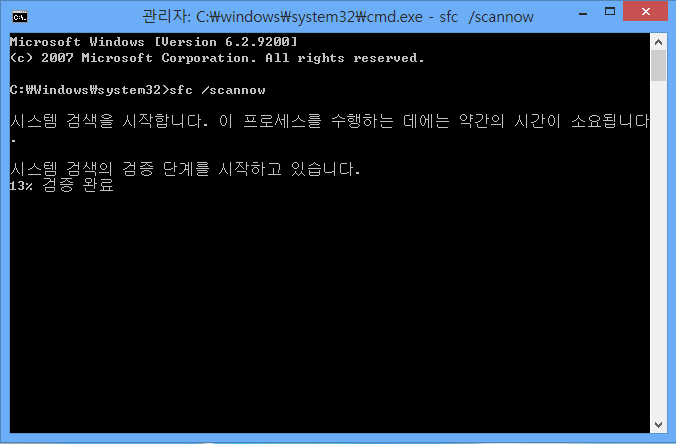 재부팅 하였을 때 윈도우즈 진입 전 chkdsk가 실행이 되며, 하드디스크 검사를 시작합니다.